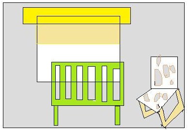 Step 1: Get rid of the old furniture and try out some more baby-centric duds for the room. Crib, bookshelf, and daybed.